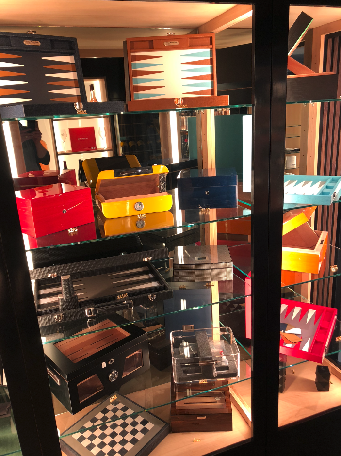 Backgammon et jeux d’échec de luxe, caves et étuis à cigares, briquets, petite maroquinerie, remontoirs pour montres automatiques, accessoires…